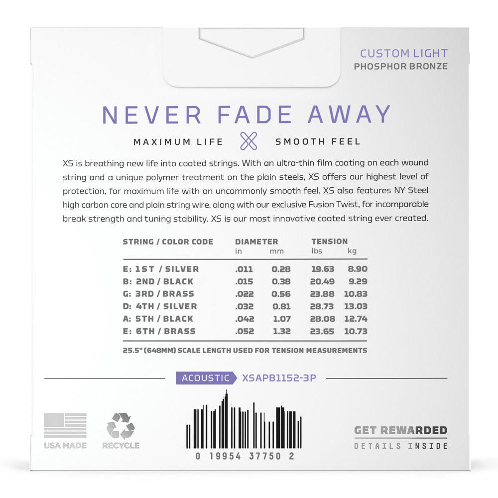 A D Addario XS Phosphor Bronze para violão aço representa o início de uma nova era em cordas revestidas. Com seu revestimento ultrafino em cada corda espiralada e tratamento de polímero exclusivo nas cordas lisas, a XS oferece durabilidade extrema com o mais alto nível de proteção, além de um toque surpreendentemente suave. Nossa exclusiva tecnologia Fusion Twist reduz o atrito da corda com o nut, assim você passa mais tempo tocando e menos tempo afinando. O consagrado núcleo NY D'Addario, com alta concentração de carbono, produz resistência e estabilidade de afinação incomparáveis. XS é a corda revestida mais inovadora já criada.