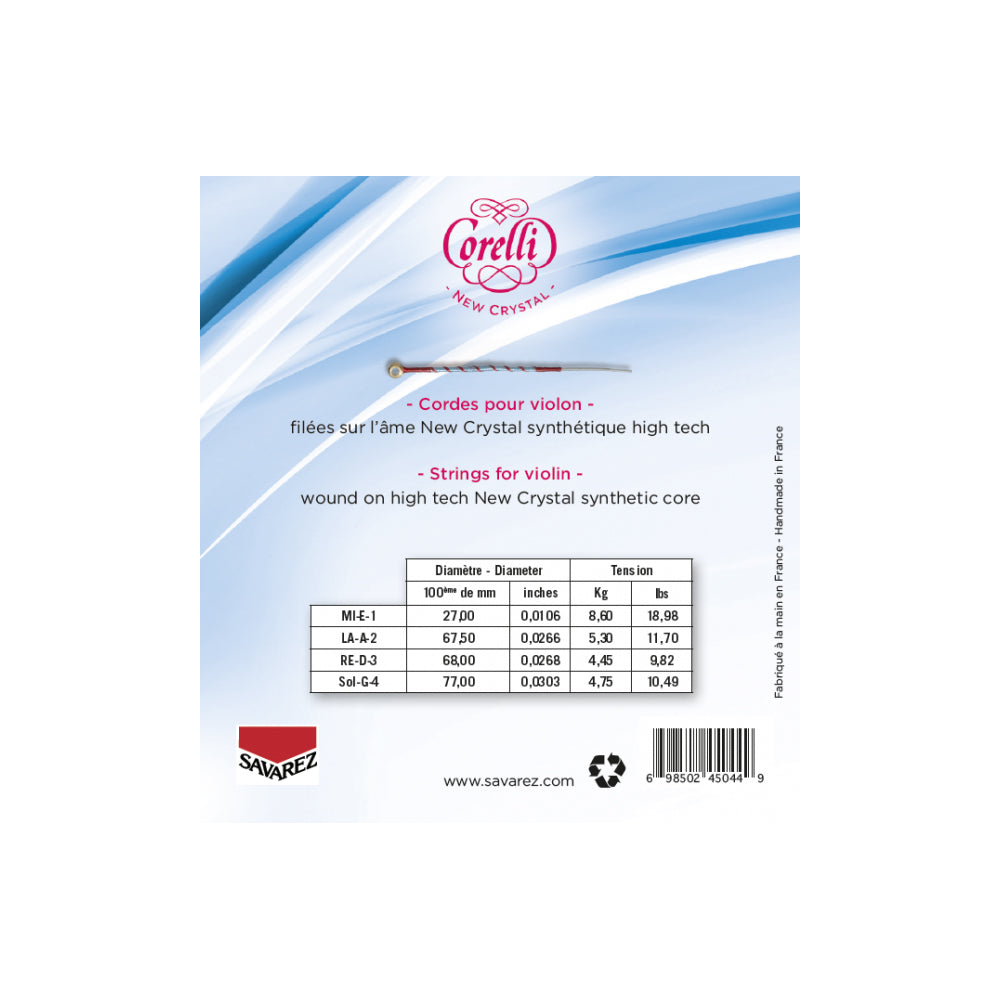 A inovação da Corelli New Cristal para Violino consiste no seu novíssimo material em nylon, que supera todas as expectativas e características das cordas em nylon, comumente conhecidas. Esse aprimoramento resultou em um som encorpado com qualidade e volume, mantendo a elegância do timbre clássico, com mais tocabilidade e maior projeção sonora na resposta.